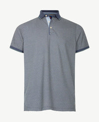 Moderne herenpolo in gedraaid wiebertjesdessin. Van katoen piqué et iets elastan voor het draagcomfort en de rek. Baileys koos voor aangezette boordjes langs de mouwen in marineblauw, die net als de kraag een streepje van wit heeft. De knoopkant van het beleg is uni marineblauw, net als de splitjes aan de zijkant van de polo. De binnenkant van de kraag en de andere kant van het beleg hebben een contraststof in jeans. Sluit met 3 knoopjes. Rustige kleurencombinatie in een vlot dessin.