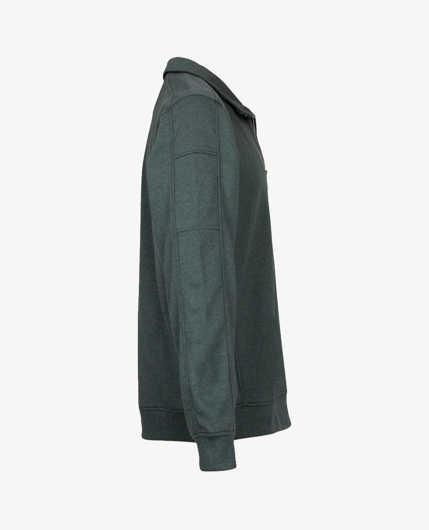 Herenpullover met rits in een gemende kwaliteit met katoen en lekker licht is. Uitgevoerd in een structuurtje met navy en groen. Op de mouw is een zakje met rits verwerkt, handig voor het opbergen van kleine dingen. Sportieve rits voor de kraag, het beleg heeft een bies van navy met wit. De mouwen hebben, net als de boord, een tricot boord die mooi aansluit. Prachtige kwaliteit die door de toevoeging van polyester goed vormvast is, licht draagt en snel droogt. Gemakkelijk aan- en uit te doen door de rits.