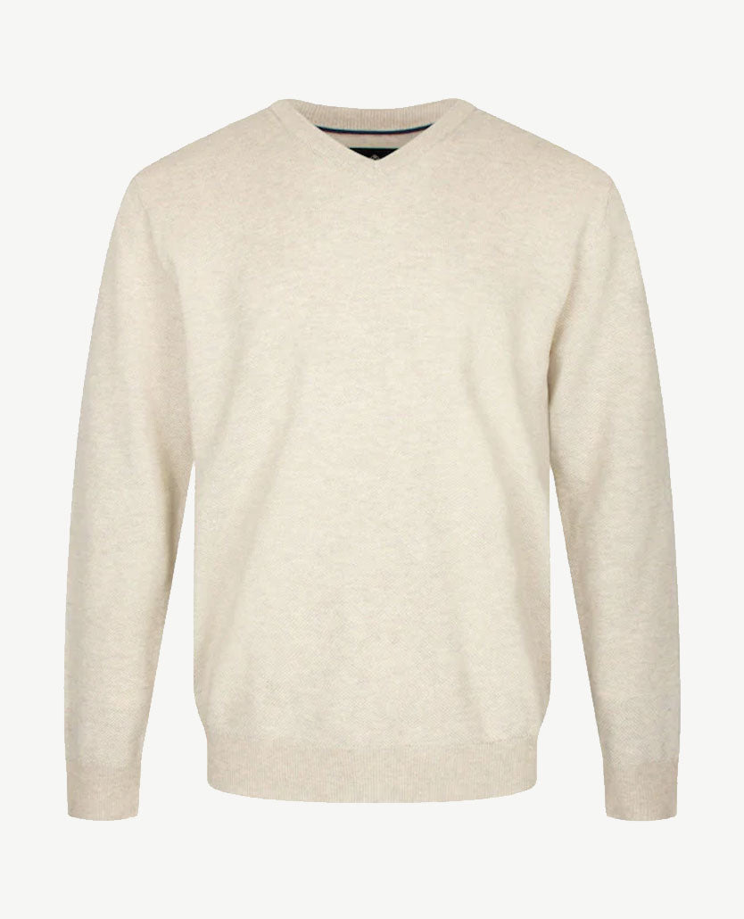 Moderne, tijdloze pullover in een klein structuurtje gebreid, net weer iets nieuwer en beige is het nieuwe blauw! Uitgevoerd door Baileys in een niet te dikke kwaliteit van 100% katoen met een mêlée effect.  De v-hals sluit mooi aan en is niet te diep. Zeer comfortabel, zeer goed wasbaar, blijft jaren mooi.