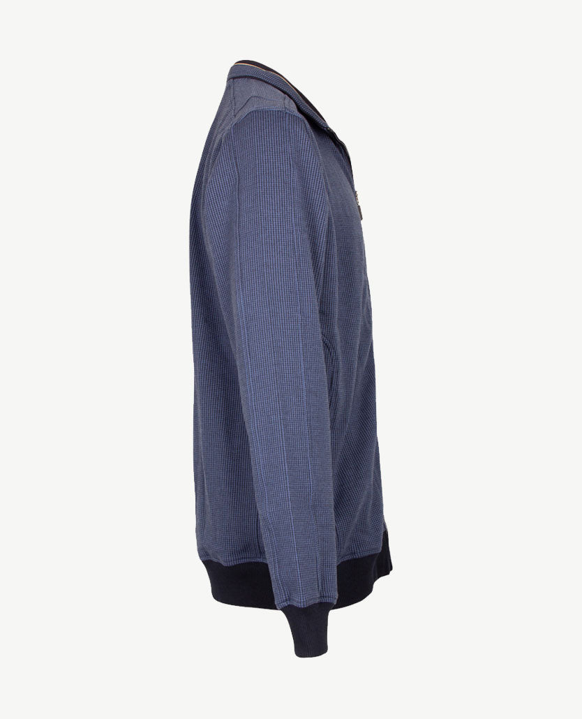 Tijdloos, classy vest met opstaande boord met rits. De kraag is aan de buitenkant van dezelfde kleur als de rest van het vest, de binnenkant heeft een afwerking met marineblauw en een streepje. De ritsen (ook van de zakken) hebben een streep met contrast kleur. De mouwen en zoom zijn afgewerkt met een tricotboord. Baileys staat bekend om de prachtige kwaliteiten en daar is dit een goed voorbeeld van. Prachtige kwaliteit met katoen en wat menging voor de vormvastheid en de lichtheid.