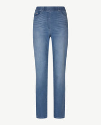 Aansluitende damesjeans met elastiek rondom, in een heel soepele fijne katoen. Dit model, de Lavina Joy van Brax Raphaela heeft een liftend effect aan de achterkant. Dat komt door de verwerking van de stof en de schnitt. Ook deze taille geeft wat meer ruimte zonder dat u een maat groter hoeft te kiezen! Er is een gulp opgestikt, de broek oogt dus als een gewone pantalon. Een prachtige broek die heel comfortabel zit. Open zakken aan de voorkant, aan de achterkant opgestikte zakken die ook open zijn. En de band in dezelfde stof als de rest van de broek, met riemlussen. Super pasvorm!