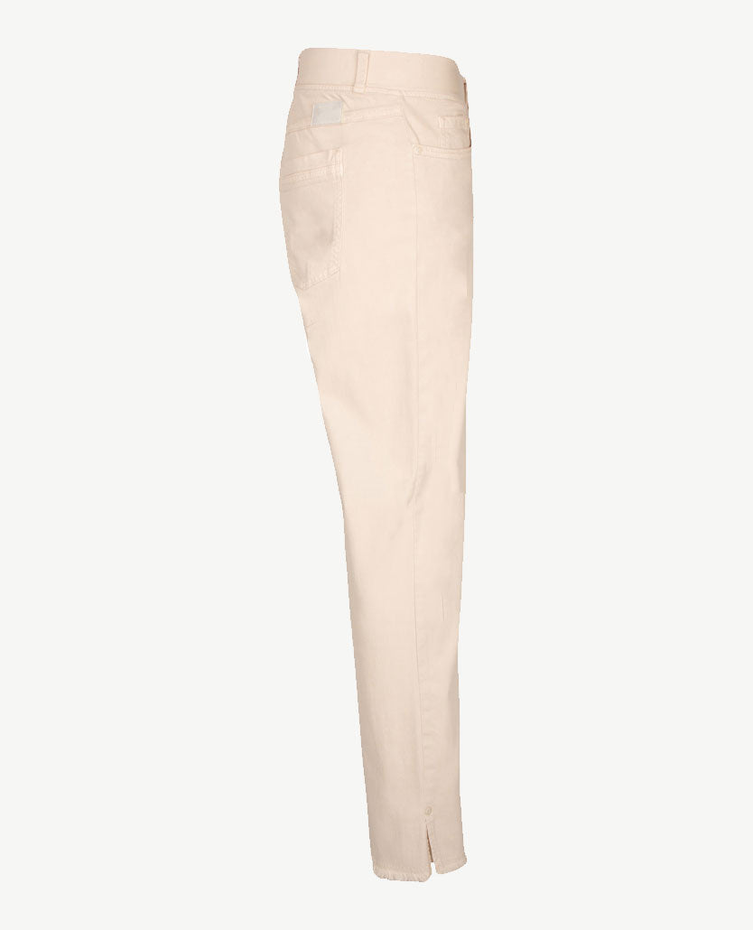 Aansluitende damesbroek met elastiek rondom, in een fijne katoen. Dit model, de Lavina Fringe van Brax Raphaela heeft pijpen met een klein splitje aan de zijkant en leuke nette rafeltjes, dat maakt het wat nonchalanter en sportief. Ook deze taille geeft wat meer ruimte zonder dat u een maat groter hoeft te kiezen! Er is een gulp opgestikt, de broek oogt dus als een gewone pantalon. Een prachtige broek die heel comfortabel zit. Zakken aan de voorkant die sluiten met een ritsje, aan de achterkant opgestikte zakken. En de band in dezelfde stof als de rest van de broek, met riemlussen.