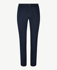 Herenbroek met elastische band in een luxe, wat dikkere kwaliteit katoen met stretch heeft een aansluitende pasvorm én elastiek rondom. Deze broek van D.Y.P. is uitgevoerd in een stof met een klein structuurtje. Voor mannen die een broek met een wat modernere fit willen hebben. De naden zijn in kleur doorgestikt. Twee open, opgestikte zakken aan de achterkant en twee open steekzakken aan de zijkant. Het elastiek in de band is doorgestikt, zodat het niet draait en omkrult en heeft riemlussen en een knoop (voor de sier).