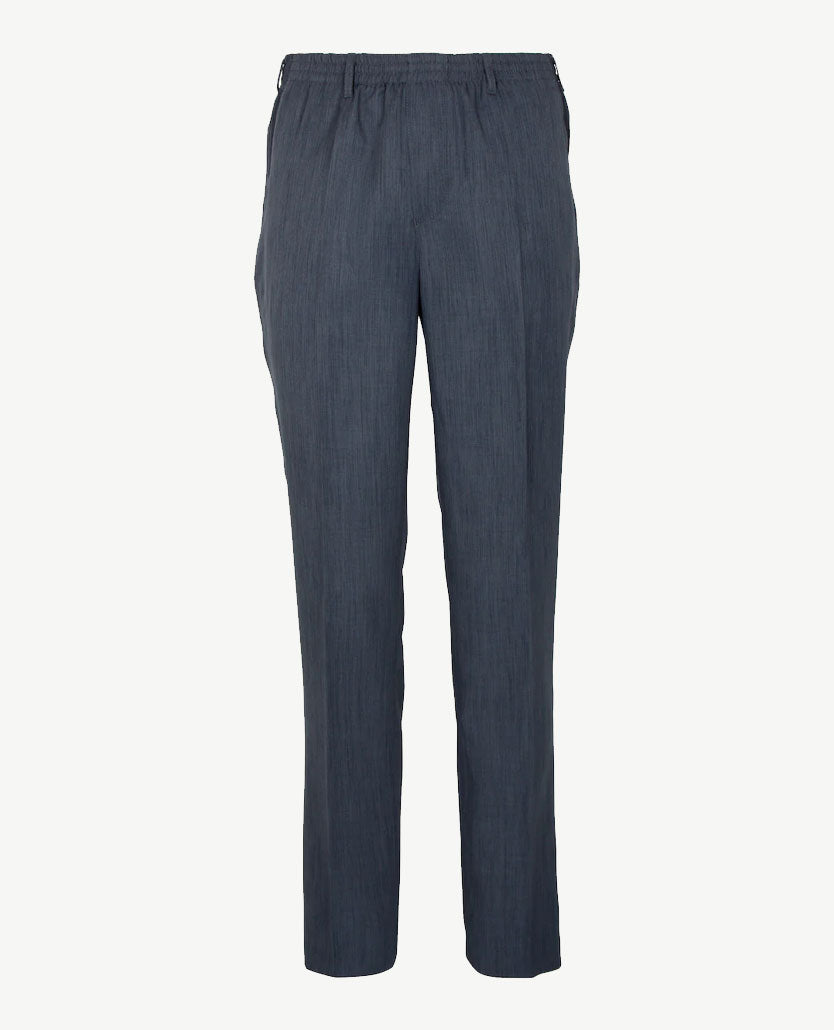 Nette, klassieke herenbroek met doorgestikte elastische band in een luxe vormvaste, dunne kwaliteit van polyester. Deze kwaliteit blijft het mooist in het dragen en wassen en lijkt op een gabardine stof die voor pakken gebruikt wordt. Deze broek van D.Y.P. is voor mannen die een broek met een wat wijdere, klassieke fit willen hebben. Twee steekzakken aan de zijkant en een afsluitbare aan de achterkant. Met riemlussen.