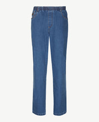 Sportieve 5- pocket jeans, met doorgestikte elastische band is van ons eigen merk. Deze broek van D.Y.P. is voor mannen die een broek met een wat sportievere fit willen hebben. Al onze broeken zijn van een luxe kwaliteit, goed voor veel jaren draagplezier. De naden zijn op kleur doorgestikt. Twee zakken aan de voorkant met het bekende 5-e zakje in de rechterzak. Op de achterkant 2 opgestikte open zakken. Met riemlussen.