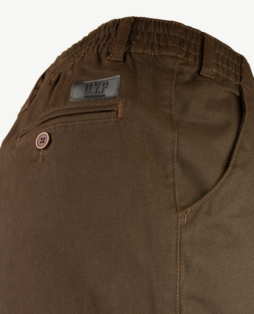 Nette, sportieve, wat dikkere, katoenen broek met doorgestikte elastische band in onze super fijne kwaliteit in een fijne basiskleur. Deze kwaliteit heeft een zachte vleug, dat maakt het net weer even anders. Kan ook het hele jaar door gedragen worden. Deze broek van D.Y.P. is voor mannen die een broek met een wat wijdere, klassieke fit willen hebben. De naden zijn op kleur doorgestikt. Twee steekzakken aan de zijkant en een afsluitbare aan de achterkant. Met riemlussen. Wat dikkere kwaliteit.
