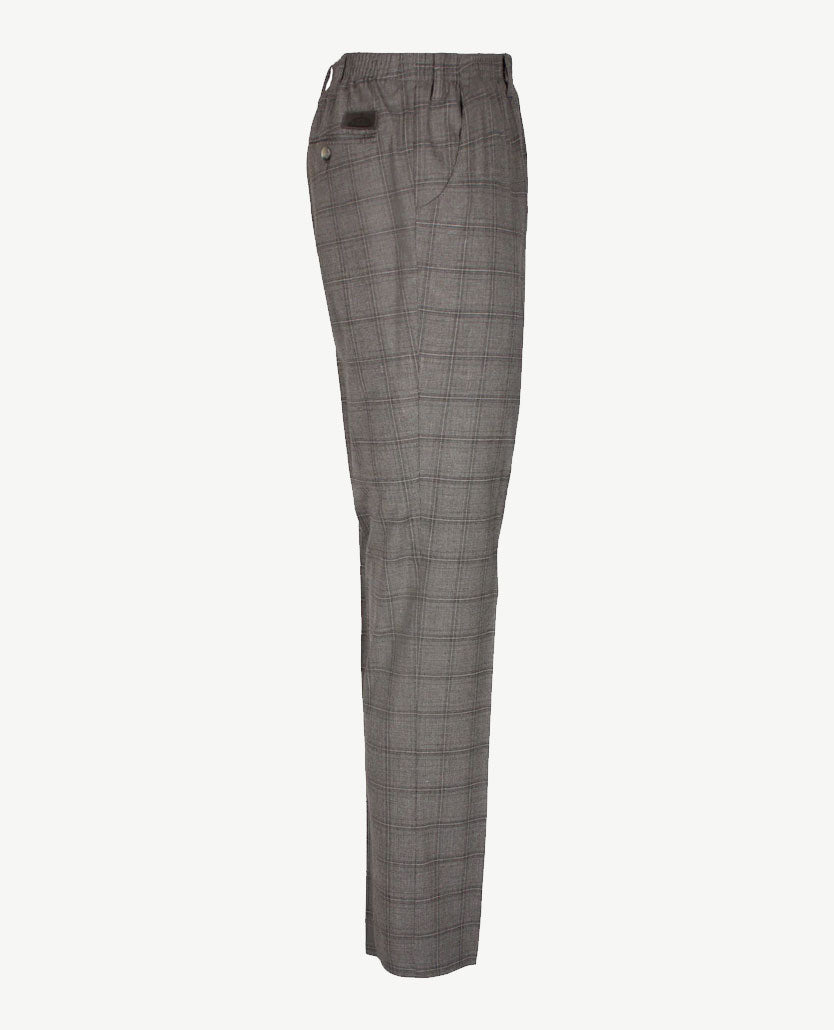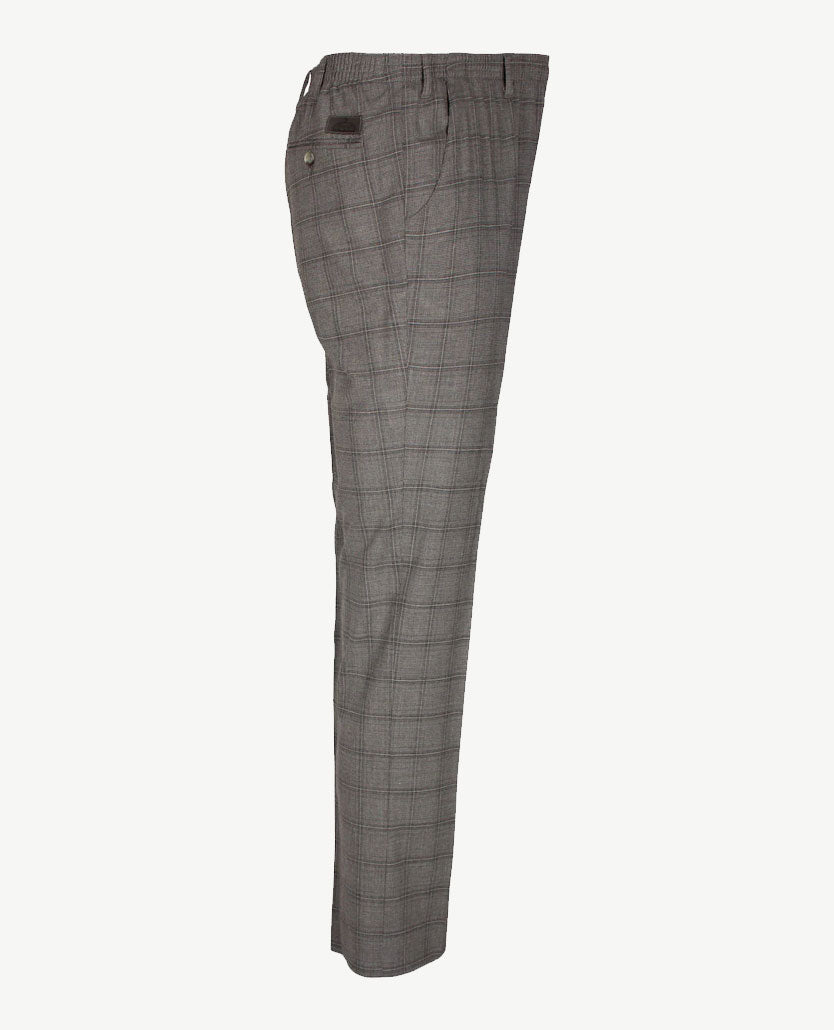 Nette, sportieve broek in een leuke, lichte stof met een klein ruitje en met doorgestikte elastische band is van ons eigen merk. Deze broek van D.Y.P. is voor mannen die een broek met een wat wijdere, klassieke fit willen hebben. De naden zijn op kleur doorgestikt. Twee steekzakken aan de zijkant en een afsluitbare aan de achterkant. Met riemlussen. Weer eens wat anders!