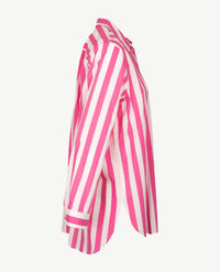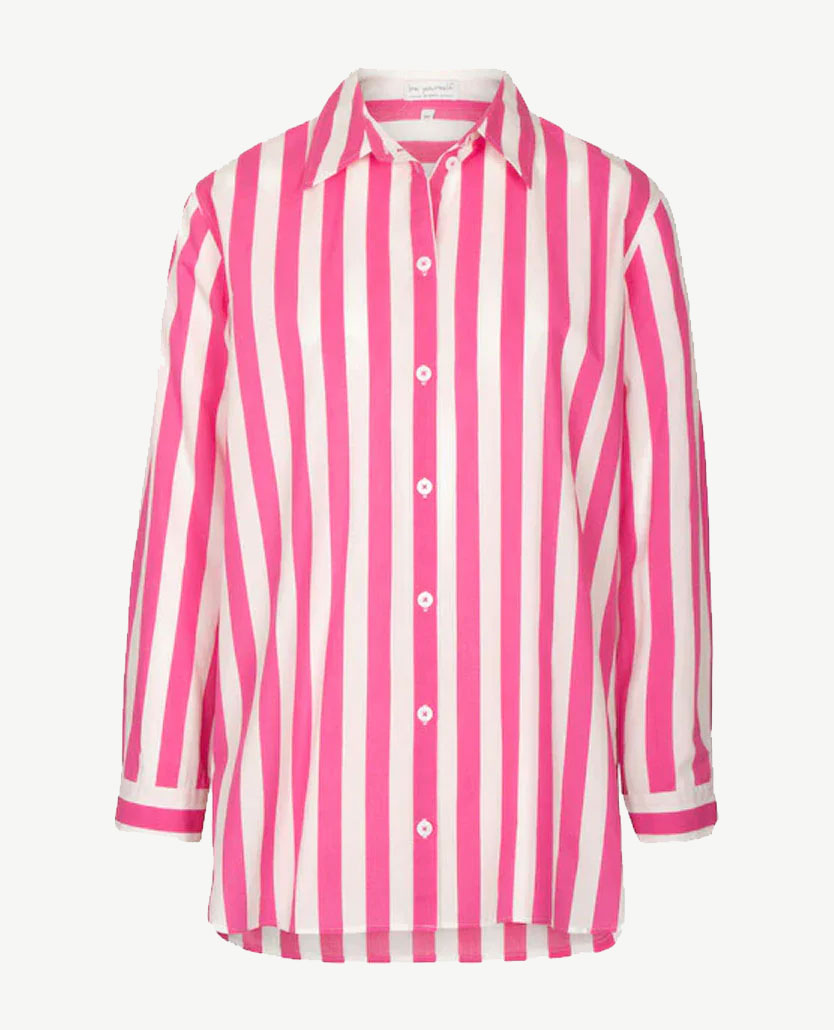 Lange, sportieve blouse in een poplin stof in een soepele kwaliteit van 100% katoen.  De smalle manchetten hebben een streep over dwars en sluiten met een knoopje. Sportief als de mouwen omgeslagen worden. De zoom is rondgesneden, en de blouse heeft aan de zijkanten twee grote splitten. De kraag is dubbel en van dezelfde stof. De knoopjes vergemakkelijken het aan- en uitdoen. Goed wasbaar. Van Erfo.