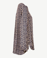 Tuniekblouse in een prachtige kleurstelling met beige en navy. Smal boordje dat eindigt in een v-hals. Ook de manchet heeft een smal boordje en sluit met 1 knoopje. Modern en uitgevoerd in een prachtige luxe satijn viscose kwaliteit, heel zacht op de huid. Zowel chique als sportief te dagen. Vanuit de kraag valt aan de achterkant een plooi, valt lekker wijd. De zoom is rond gesneden, van achter iets langer en heeft splitjes aan de zijkant.