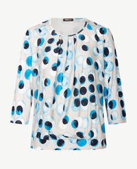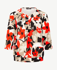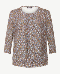 Bekende blousontop van Frank Walder in mooie warme kleurstelling met zwart. De 3-4 mouwen, het achterpand en de onderlaag zijn van een fijne jersey gemaakt, de overstof aan de voorkant van een luxe viscose, dat valt wat losser. De ronde hals geeft ruimte aan enkele plooitjes. De aangezette boord is van hetzelfde dessin gemaakt en sluit rustig aan met een iets bloezend effect.