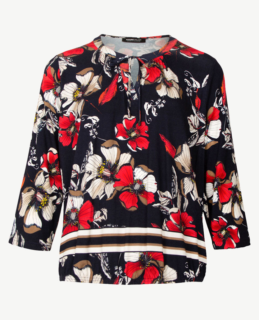 Blousontop van Frank Walder in sprekend dessin op een navy basis, uitgevoerd in een jersey kwaliteit. De hals is dubbel uit de stof, eindigt in een v-hals en heeft een koordje in hetzelfde dessin. In de boord soepel tunnelelastiek. Bloezend effect, kan ook ín iets gedragen worden.