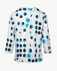 Bekende blousontop van Frank Walder in mooie frisse kleurstelling het hele jaar draagbaar. De 3-4 mouwen, het achterpand en de onderlaag zijn van een fijne jersey gemaakt, de overstof aan de voorkant van een luxe viscose, dat valt wat losser. De ronde hals geeft ruimte aan enkele plooitjes. De aangezette boord is van hetzelfde dessin gemaakt en sluit rustig aan met een iets bloezend effect.
