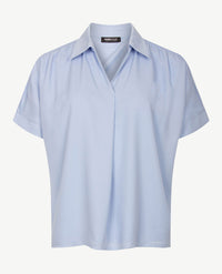 Superleuke, gevoerde top met een kraag. Schijnt dus niet door. De bovenstof aan de voorkant van de polo van Frank Walder is van een dubbel voile. De voering en achterkant van een soepel jersey. Raglanmouwtje en plooitjes bij de schouderpas voor extra ruimte. Echt n mooi blouseje dat als combinatietop onmisbaar is in de collectie. De polokraag is helemaal terug van weggeweest.