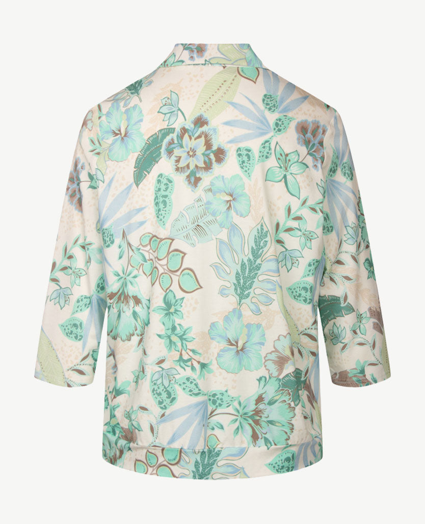 Damespolo in een fris dessin met taupe, groen en turquoise en bleu. Frank Walder heeft een fijne jersey uitgekozen voor dit model, rekt lekker mee. De kraag is dubbel en doorgestikt, net als het beleg. Kan hooggesloten worden met 5 knoopjes en toch open door het extra hoge knoopje. Onderaan een soepele boord waardoor een bloezend effect ontstaat. Kan zo wel in, als over iets heen gedragen worden. We hebben er een mooi taupe kleurige rok bij.