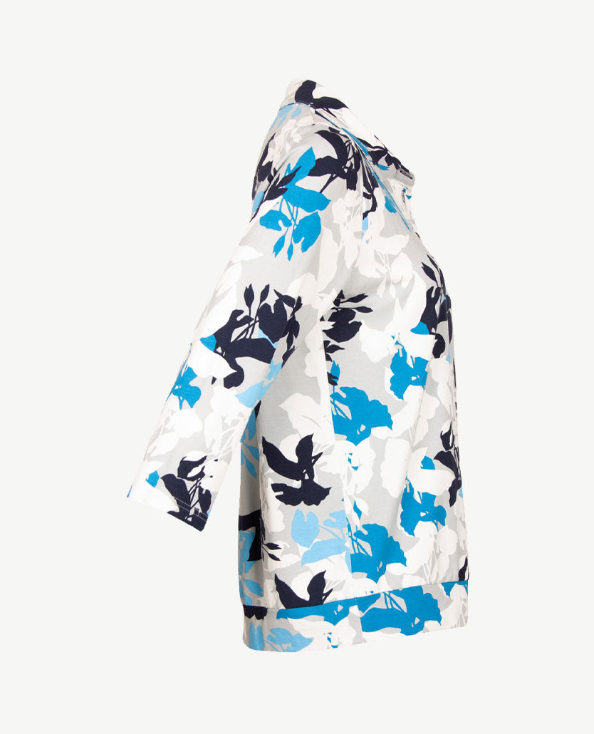 Classy damespolo in een over-all dessin. Groot opgezet dessin in een kleurencombinatie die fris is. Gemaakt van een fijne, luxe jersey die meerekt, heel comfortabel dus. De kraag van deze polo van Frank Walder kan hoog gesloten worden met 5 knoopjes. Onderin een brede band in hetzelfde dessin; dat zorgt voor een licht bloezend effect. Lange mouwen.