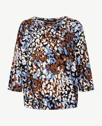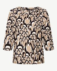 Top in een sprekend zigzag dessin. Frank Walder bekend om de sterke dessins! De ronde hals valt niet te laag  en heeft een brede boord die dubbel van stof is. Raglanmouw van 3/4 lengte. Sprekend dessin door de toevoeging van off-white, rood en iets zwart. Ook een fijne top om mee te nemen in de koffer omdat het overal bij te combineren is, geen besmettelijke kleur. Gemakkelijk aan-en uit te doen en goed wasbaar.