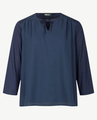 Deze blousontop hebben we aan onze collectie toegevoegd omdat die zo fijn combineert. Het is een model van Frank Walder dat bij alles past, uitgevoerd in een fijne jersey gecombineerd met een voile voorkant. De mouwen en het achterpand zijn uitgevoerd in een jersey stof, net als de onderlaag onder het voile. De kleine v-hals kan gesloten worden met een koordje. De schouderpas heeft een smock effect en geeft ruimte aan wat extra plooitjes. Kan zowel sportief als wat chiquer gedragen worden.