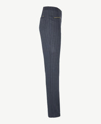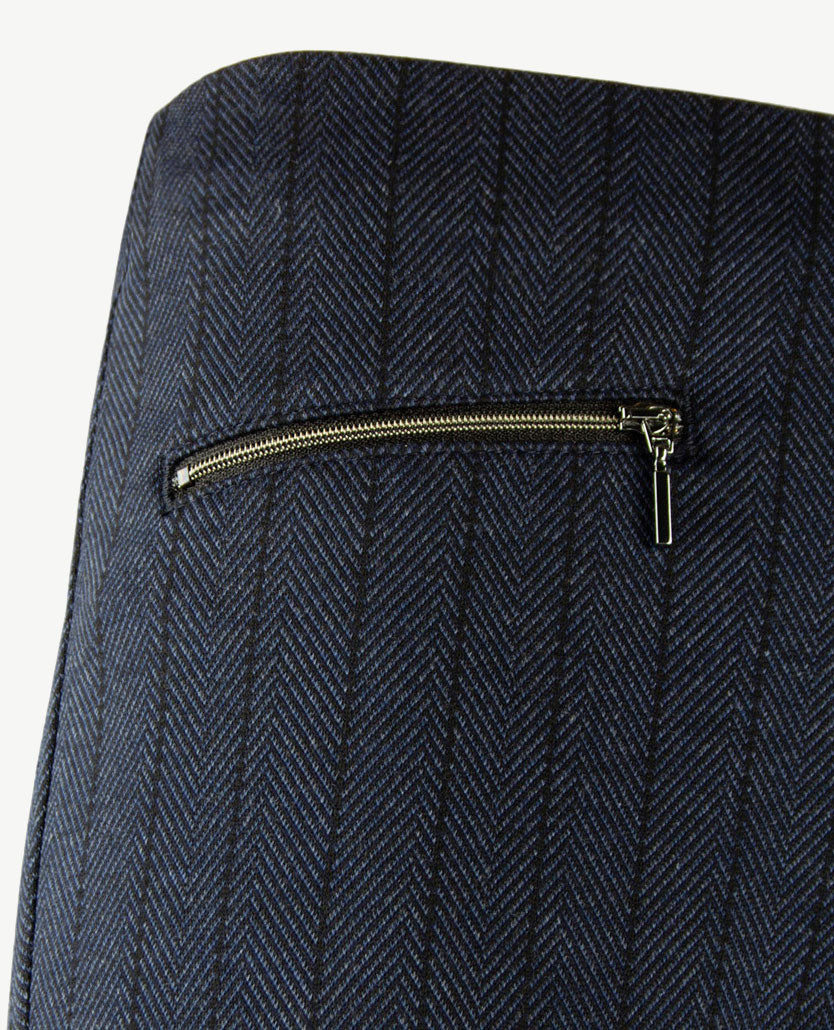 Moderne classy broek in een luxe jersey stof met elastan, in een fijne visgraat. Stijlvol en tijdloos. Het verschil met de Zene14 is dat hier zakjes met ritsjes aan de voorkant verwerkt zijn en er aan de zijkanten geen splitjes zijn bij de enkel. De pijp is slank gesneden. Twee faux zakken aan de achterkant. Een brede boord van elastiek die meeloopt in de stof.