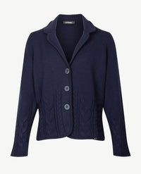 Dit blazervest in een hele zachte kwaliteit die aanvoelt als wol maar het niet is, van Gollé Haug, heeft veel mooie details. Zo zijn er verschillende kabels meegebreid, verlopend in de mouwen en onder in het vest. De dubbele reverskraag is met een dubbele bies afgewerkt. Sluit met drie knopen. Het hele jaar door draagbaar en super combineerbaar.