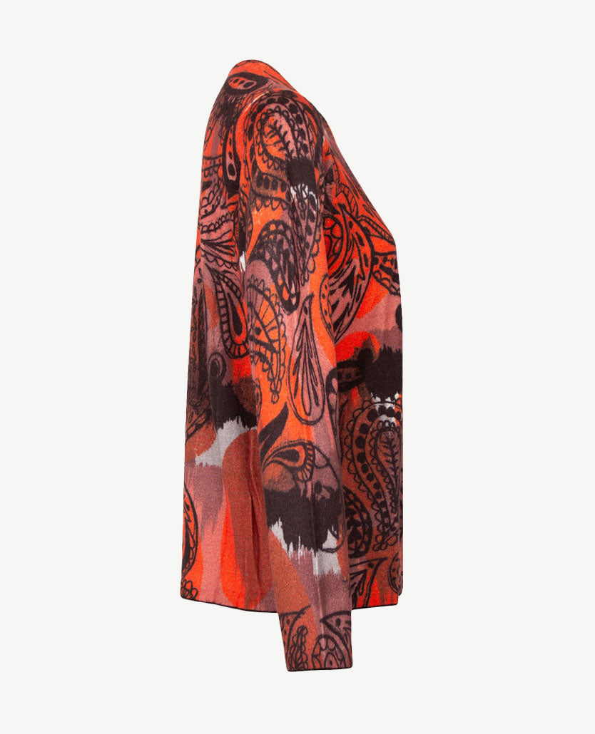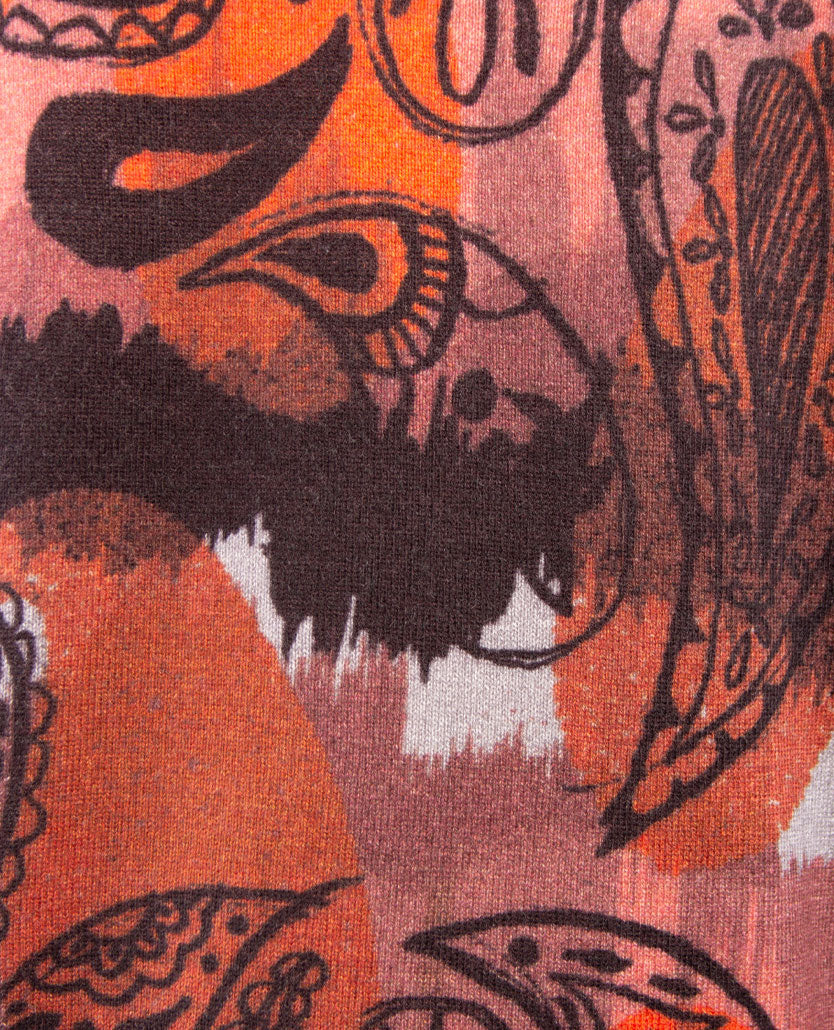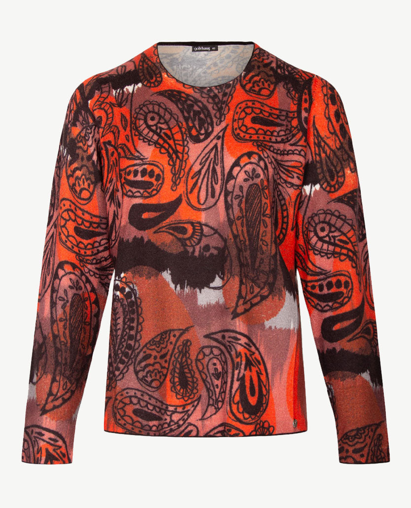 Charmante dunne pullover in een warm dessin van warme kleuren in een glad breisel. Prachtige zachte kwaliteit met katoen en heel iets cashmere (3%). De eenvoud van deze pullover is de tevens de kracht. De ronde hals heeft fijn ribbel breisel en valt niet te laag. Combineert goed met zwart en de burnt orange kleur fleurt iedereen op.  Eigenlijk het hele jaar draagbaar.
