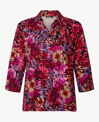 Damespolo in een prachtig retrodessin met veel kleuren, die bij heel veel kleuren broeken en rokken mooi staat. Uitgevoerd in de zachte jersey van Gollé Haug,  die rekt fijn mee. De polo heeft lange mouwen en het dubbele beleg sluit met 5 knoopjes, met dat ene knoopje hoogsluitbaar, maar toch open. De kraag is dubbel gemaakt van hetzelfde dessin. Zeer gemakkelijk wasbaar in een viscose/elastan kwaliteit die heel goed ademt.