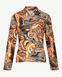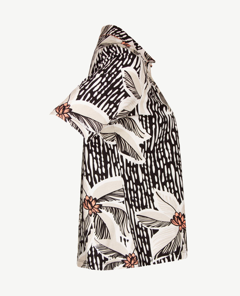 Moderne polo in een sterk dessin van zwart met orange, met kraag in een jersey kwaliteit die goed ademt. De kraag en het beleg zijn dubbel uit de stof gesneden. Het beleg heeft een uni, zacht oranje kleur. Fijne zachte jersey kwaliteit met veel katoen. Gollé Haug heeft deze polo een sluiting met 2 knoopjes gegeven, niet tot bovenaan sluitbaar, net iets hipper. De korte mouw valt mooi lang.