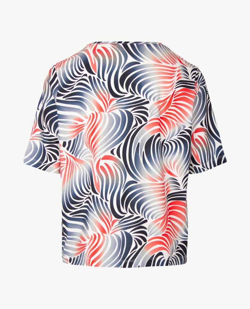Top met ronde hals in een sprekend dessin, uitgevoerd in een jersey kwaliteit die goed ademt. Dubbel biesje langs de hals uit dezelfde stof. De korte mouwen vallen mooi lang en de hals niet te diep. Fijne zachte kwaliteit van Gollé Haug.