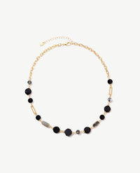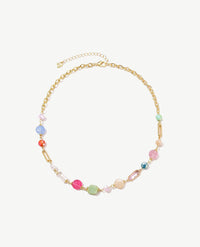 Korte ketting met verschillende soorten lichte stenen en kralen op een basis van goudkleur. Charmant en stijlvol. Gemakkelijk sluitbaar. Zo'n ketting die elke outfit af maakt en heel draagbaar is.