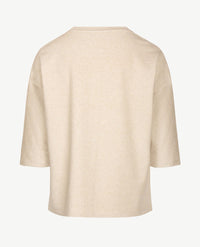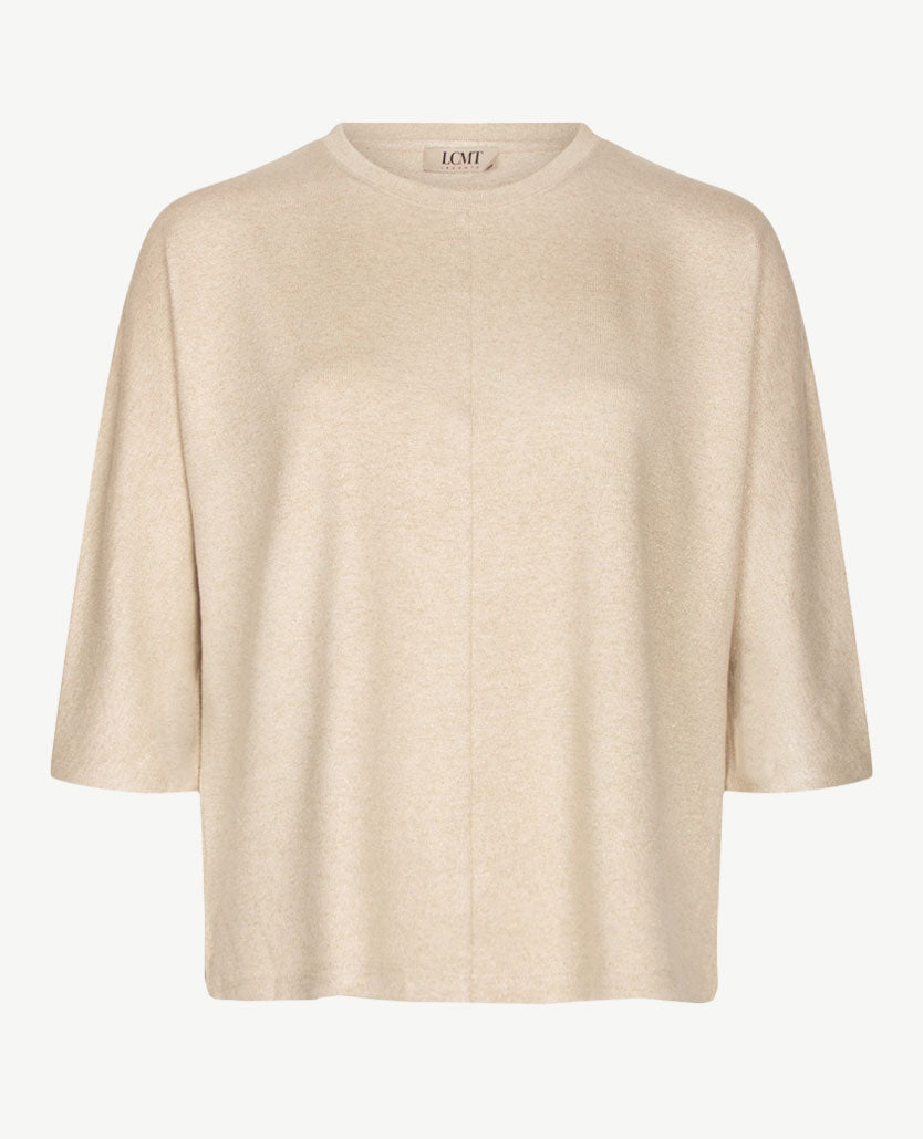Dunne pullover in een stijlvolle kleurstelling met beige en subtiel gouddraad. Geeft elke outfit iets extra's terwijl het toch een hele goed basistop is. In de bekende jersey kwaliteit van LeComte; soepel gebreid en heel zacht. De ronde hals heeft een dubbele bies en de 3/4 raglan mouw valt mooi lang en sluit lichtjes aan. Splitjes aan de zijkanten, kan dus goed over iets heen gedragen worden. Top top die met eigenlijk alles te combineren is!