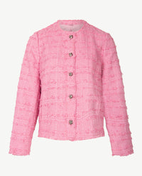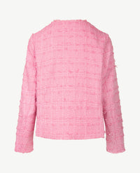 Modern, kort 'Chanel' gevoerd vestjasje in super combineerbare kleur. Van Rabe, in een mooie lichte kwaliteit, charmant en classy. Bouclé achtige stof, in een subtiele ruitverwerking met fringes langs de hals, mouwen en het beleg. Twee steekzakjes aan de zijkanten en mooie zilverkleurige knopen maken het helemaal af. Zowel sportief met een jeans te dragen als netjes met een rok. De coupenaden aan de voorkant en de achterkant kleden slank af.