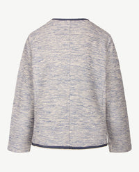 Modern, kort 'Chanel' -achtig vestjasje in super combineerbare kleuren. Van Rabe, in een mooie lichte kwaliteit, charmant en classy. Bouclé achtige stof, in een hele lichte uitvoering. Afwerking met een jeansstofje langs het beleg, de zakken en de zoom. Zowel sportief met een jeans te dragen als netjes met een rok. Licht getailleerd, dat kleedt mooi af. Met zakjes op de voorkant gestikt. Fijne kwaliteit met katoen en polyacryl, goed wasbaar en droogt snel.