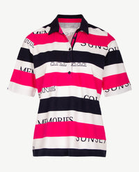 Damespolo in een lichte piqué kwaliteit van Rabe. Het brede streepdessin is aan de voor- en achterkant gelijk. Frisse kleurstelling met marine, heel combineerbaar. Dubbele kraag en het beleg, dat hoog gesloten kan worden met 5 knoopjes, heeft een luxe afwerking met een satijnbandje van beige. De korte mouw valt mooi lang. De knoopjes vergemakkelijken het aan- en uitdoen.