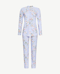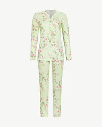 Luxe pyjama die heel goed als loungepyjama te dragen is, in een zachte luxe kwaliteit jersey van katoen met modal (ook een natuurvezel). Bij dit model van Ringella loopt de ronde aansluitende hals uit in een kleine v-hals, waaronder een plooi verwerkt is. Het beleg, dat net als de hals dubbel is, sluit met 4 knoopjes. Zacht kantje langs het beleg en het borstzakje. De broek heeft heel soepel tunnelelastiek. Door de knoopsluiting gemakkelijk aan- en uit te doen.