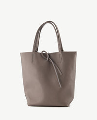 Kleine leren shopper die ook als schoudertas te dragen is. Voor als het iets kleiner mag, maar je nog wel wat meer kwijt wilt. Deze tas is ook te dragen als handtas. De tas heeft een met een rits af te sluiten tasje aan de binnenzijde, allemaal van echt leer. Zilverkleurig detail. Als leuk detail kan de tas nog dichtgestrikt worden.