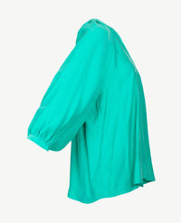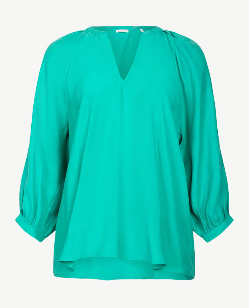 Wat een prachtige blouse in een hele zachte luxe kwaliteit. Modern en stijlvol door de plooitjes die vanuit de ronde v-hals over de schouder iets naar voren en naar achteren lopen. De v-hals valt niet te laag. De wijde mouwen komen samen bij de manchetten die sluiten met een knoopje. De zoom is rond gesneden en daardoor is deze blouse ook mooi om over iets heen te dragen. Frisse kleur groen die het hele jaar draagbaar is. Seidensticker staat bekend om de prachtige kwaliteiten en daar is dit een goed voorbeeld van.