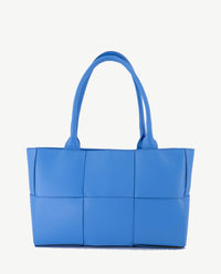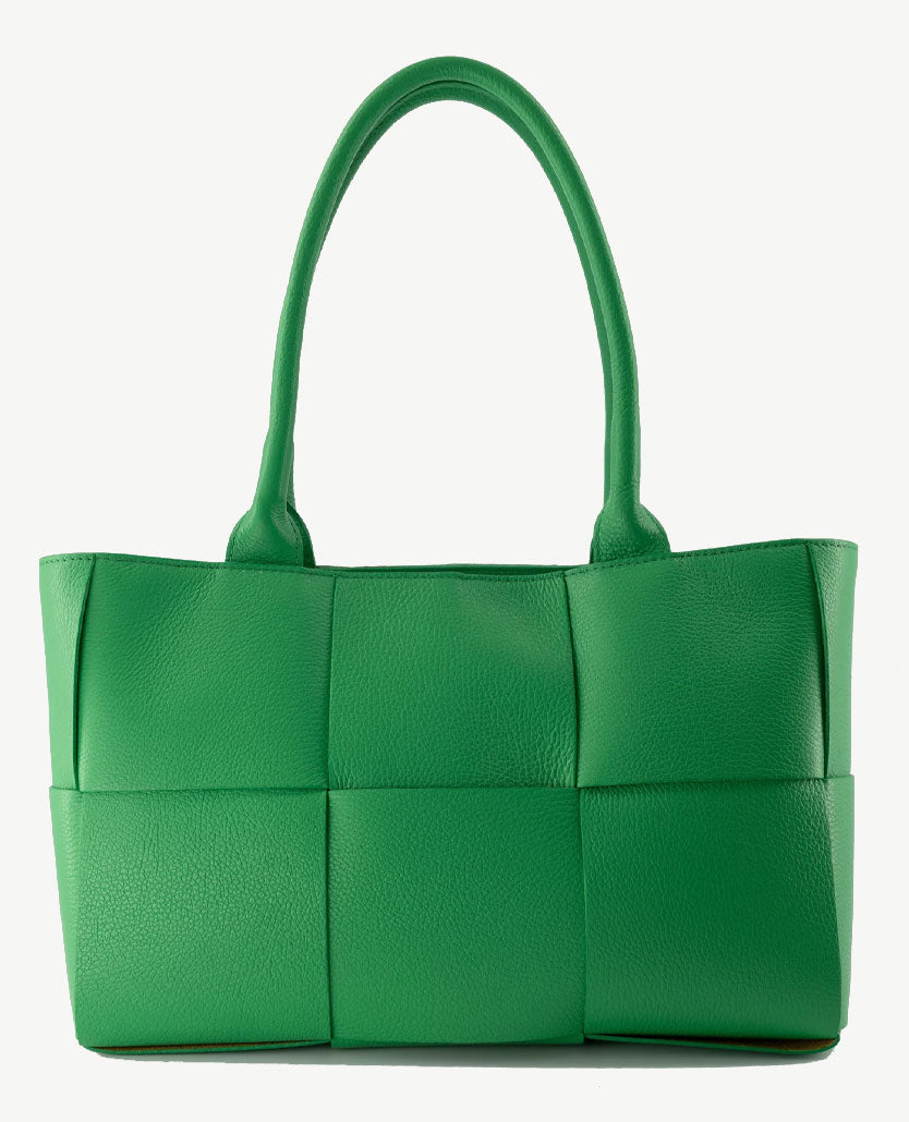 Moderne, hippe shopper of grote handtas met hengsels in een mooie, sprekende kleur groen. Gevlochten in vlakken en gevoerd. Binnenin een groot extra vak dat afgesloten kan worden met een rits. Aan de binnenwand ook nog een vakje dat afgesloten kan worden met een rits. Sluit met een bronskleurige rits. Uitgevoerd in sauvage leer.