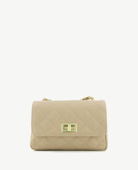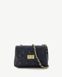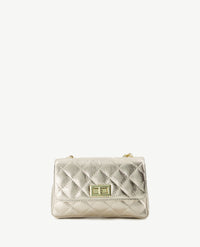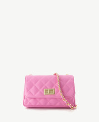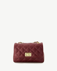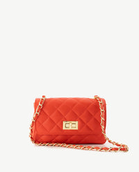 Moderne, kleine tas die 'cross-body' gedragen kan worden. Prachtige doorgestikte carré vorm. Sluit met een draaislotje. Het lange hengsel is gedraaid van goudkleurige schakels met de kleur van het tasje. Uitgevoerd in sauvage leer. De tas heeft een groot binnenvak en een afsluitbaar binnenvak.
