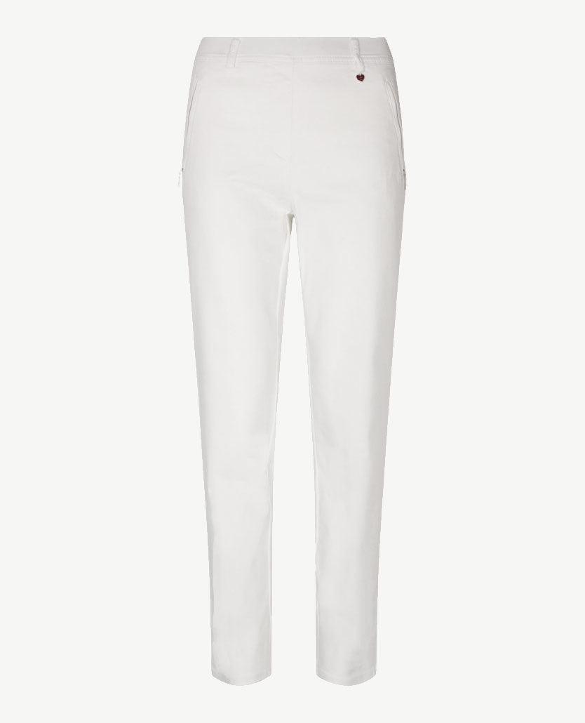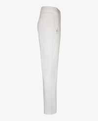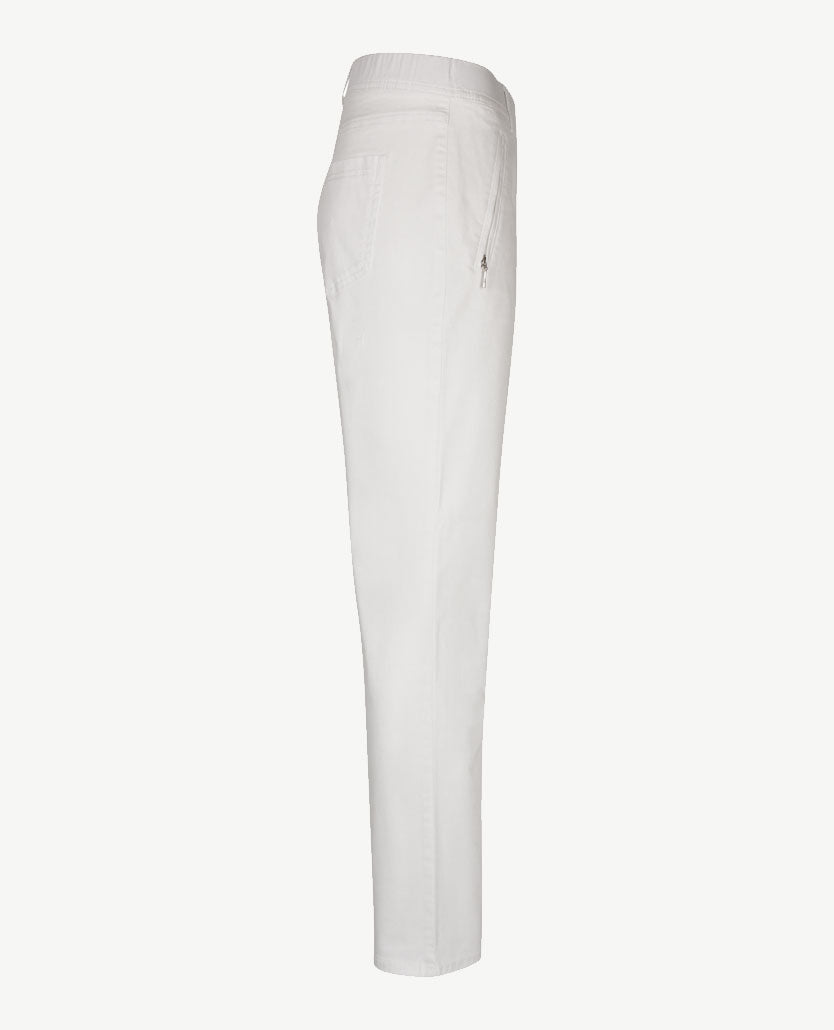 Sportieve en classy damesjeans met elastiek rondom in een fijne, stevige kwaliteit. Dat is voor een witte broek belangrijk ivm doorschijnen. Sportief model door de 7/8 lengte, van Toni en nieuw binnen de Alice serie. Dit model heeft een brede aangezette, gladde tailleband rondom met riemlussen. Ingezette stukken aan de zijkant, dat kleedt extra af. Twee zakken met ritsjes aan de voorkant en twee opgestikte op de achterkant. Zeer comfortabel.