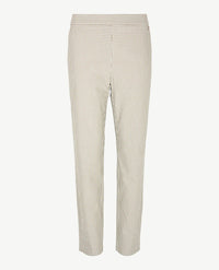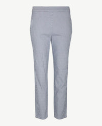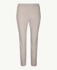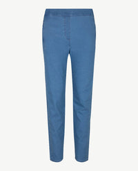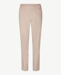 Aansluitende damesbroek met elastiek rondom, in een fijne 'soft cotton', zachte katoen dus. Dit model, Alice New van Toni, heeft een inzet aan de zijkanten, dat kleedt extra af. Kwaliteit met een 'soft touch finish', voelt heel zacht aan dus. Open zakken aan de voorkant en twee open opgestikte zakken aan de achterkant. De band is aan de voorkant van dezelfde stof en heeft daar riemlussen, de achterkant van elastiek met een wit streepje. Iets taps toelopende pijpen.