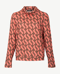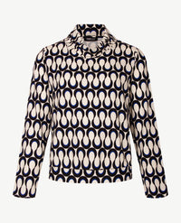Blousontop van Frank Walder in sprekend, classy dessin, dat aan slingertjes doet denken, uitgevoerd in de bekende jersey kwaliteit van Frank Walder. De hals is dubbel uit de stof in hetzelfde dessin. Met lange mouwen. De aangezette boord is ook van hetzelfde dessin en zorgt voor een bloezend effect. Kan ook ín iets gedragen worden.