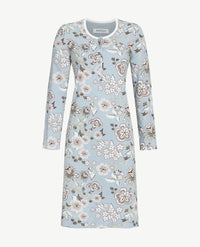 In dit luxe nachthemd van Ringella wil je lekker lang rond blijven lopen. Uitgevoerd in een zachte luxe kwaliteit jersey van katoen met modal (ook een natuurvezel). Prachtig, classy dessin gebruik. Het hele jaar door draagbaar. De hals heeft net als de mouwen een bies in off-white. De zoom is breed en iets rond gesneden. Gemakkelijk aan- en uit te doen door de knoopsluiting.