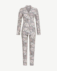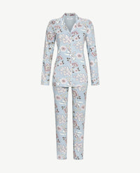 Deze luxe pyjama van Ringella, in een zachte luxe kwaliteit jersey van katoen met modal (ook een natuurvezel) valt op door het prachtige dessin gebruik. Het beleg, dat net als de hals dubbel is, sluit met 7 knoopjes. Bies in off-white langs het beleg. De kraag kleedt mooi aan bij het gezicht. De broek heeft heel soepel tunnelelastiek. Door de knoopsluiting gemakkelijk aan- en uit te doen.
