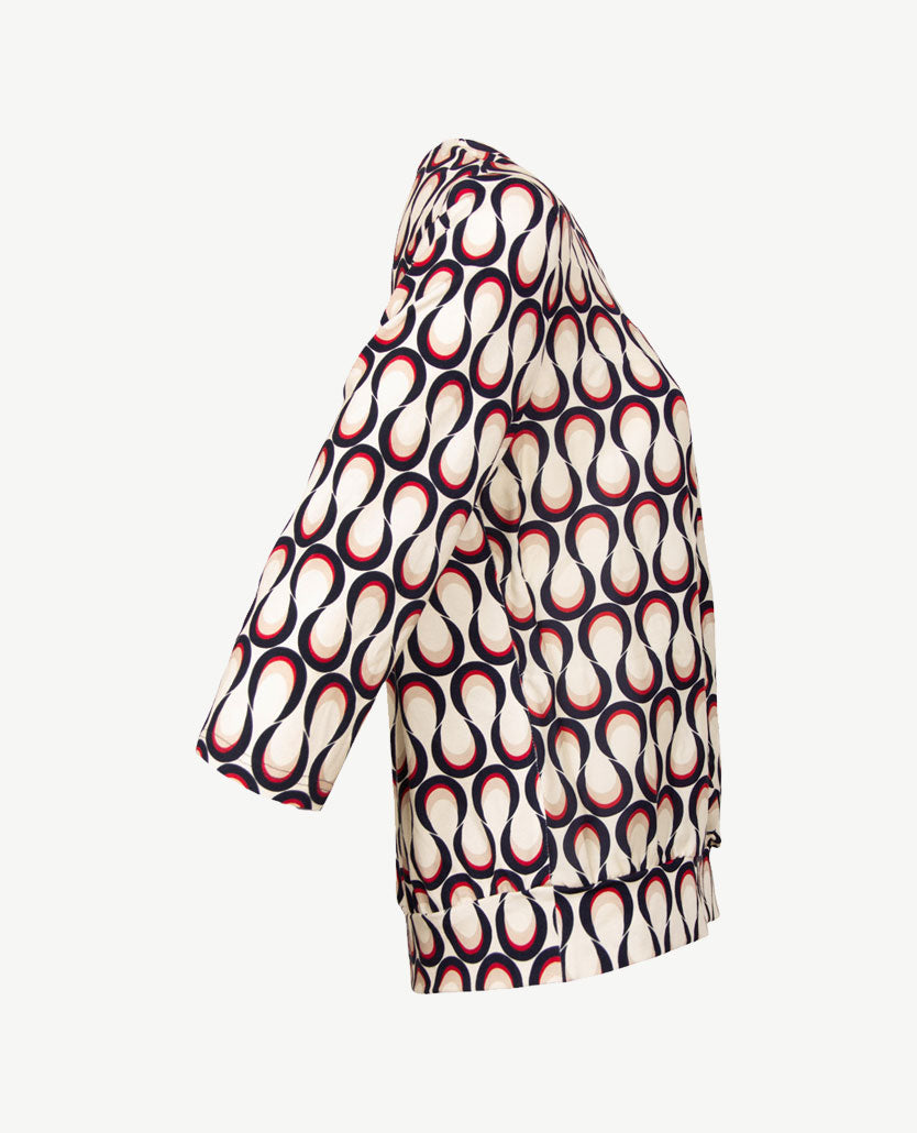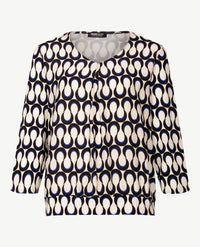 Blousontop van Frank Walder in sprekend, classy dessin, uitgevoerd in een jersey kwaliteit met daarover een een geweven gladde stof aan de voorkant. De achterkant, mouwen en boord zijn van jersey in hetzelfde dessin. De v-hals valt niet te laag. De plooitjes bij de boord geven ruimte en een bloezend effect. 3/4 mouwen. De aangezette boord is van hetzelfde dessin. Kan ook ín iets gedragen worden.