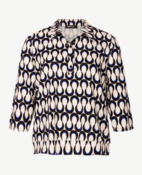 Classy damespolo in een all-over dessin. Groot opgezet met bloemen, in een kleurencombinatie met sprekende kleuren en toch warm. Gemaakt van een fijne, luxe jersey die meerekt, heel comfortabel dus. De kraag van deze polo van Frank Walder kan hoog gesloten worden met 5 knoopjes. Onderin een brede band in hetzelfde dessin; dat zorgt voor een licht bloezend effect. Kan ook ergens in gedragen worden. 3/4 mouwen die lichtjes aansluiten.